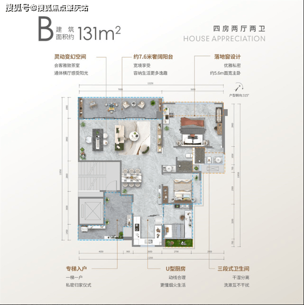 B 户型:约 131 平方米四房两厅两卫,分布在 6 号和 11 号楼内。该户型空间布局合理,四房的设计满足了家庭不同阶段的需求,无论是二孩家庭还是三代同堂,都能在这里找到舒适的居住空间。