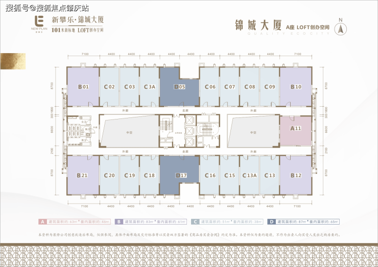 锦城大厦A座LOFT户型为:51㎡、63㎡、83㎡、87㎡
