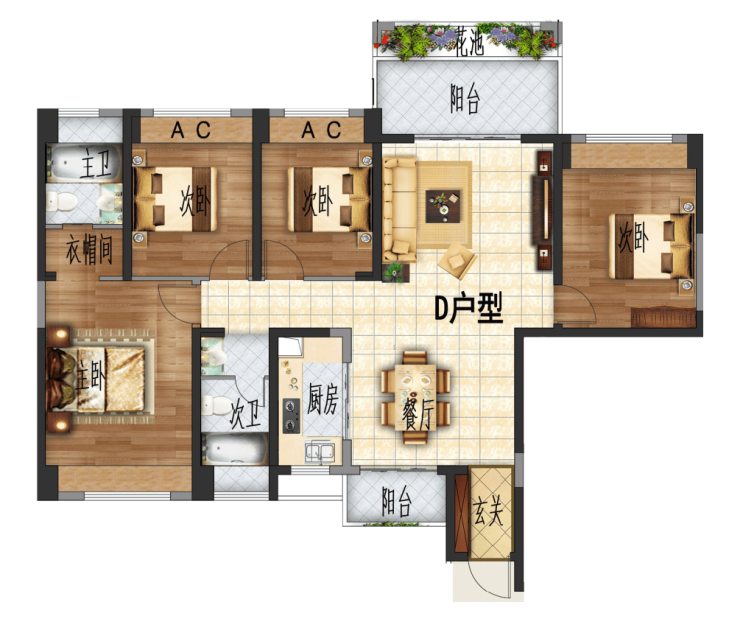 D 户型:典雅舒适四居,约 137.25㎡,四室两厅两卫双阳台。
