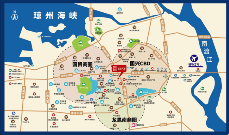 医疗康养:海南医学院第一附属医院、省现代妇女、海口市人民医院龙昆南门诊部、中国解放军第928医院;