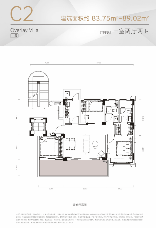 C2户型:二楼86平 三室两厅两卫