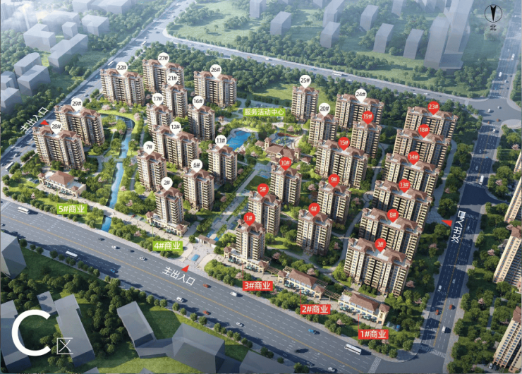 C区鸟瞰图,红色标号为在售房源楼栋
