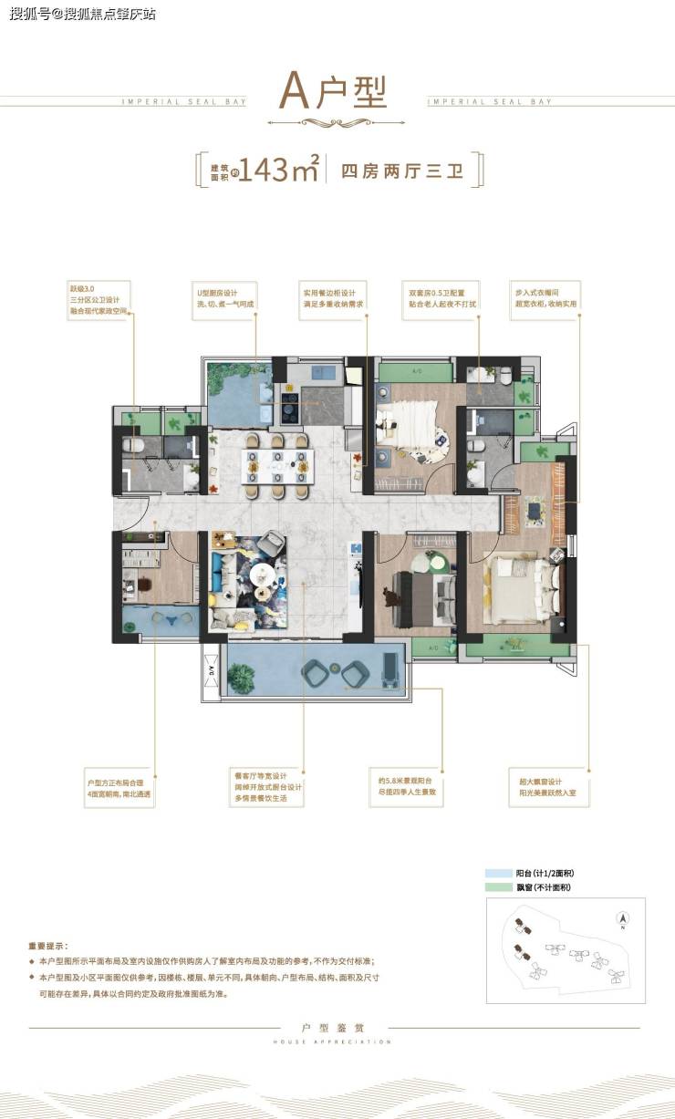 三、户型鉴赏【A户型】-143平1、户型方正布局合理,4面宽朝南,南北通透2、5.6米景观阳台,约1.7米大进深,高实用性3、跃级3.0三分区公卫设计,融合现代家政空间4、双套房0.5卫配置,贴合老人起夜不打扰