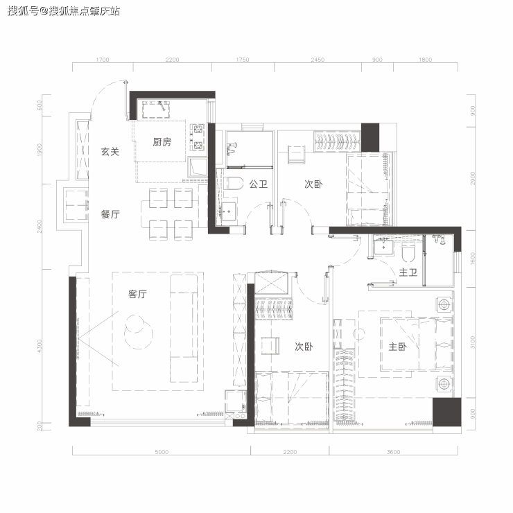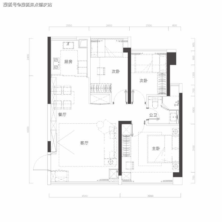 玄关入户,便捷收纳;约3.35米面宽客厅,约8米进深,客餐厅一体化;前沿S墙设计,预留冰箱位,空间零浪费;约3.8米面宽大主卧待飘窗