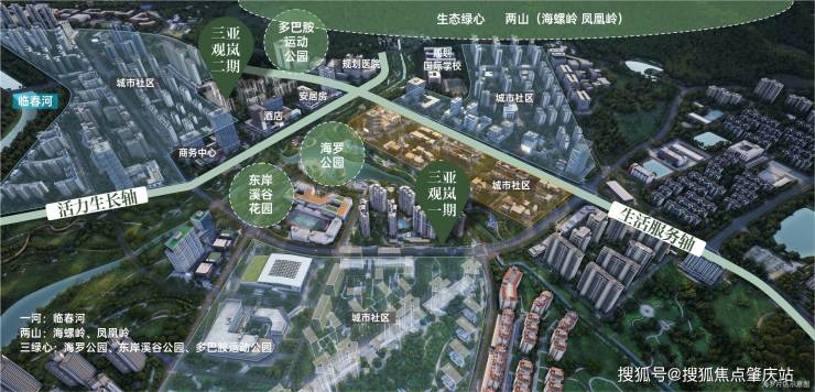 板块借“一河两山三绿心”织就三亚城芯罕见“山水绿网”,让自然与城市资源双向赋能,每一步皆穿行于自然,重塑城芯生活价值。