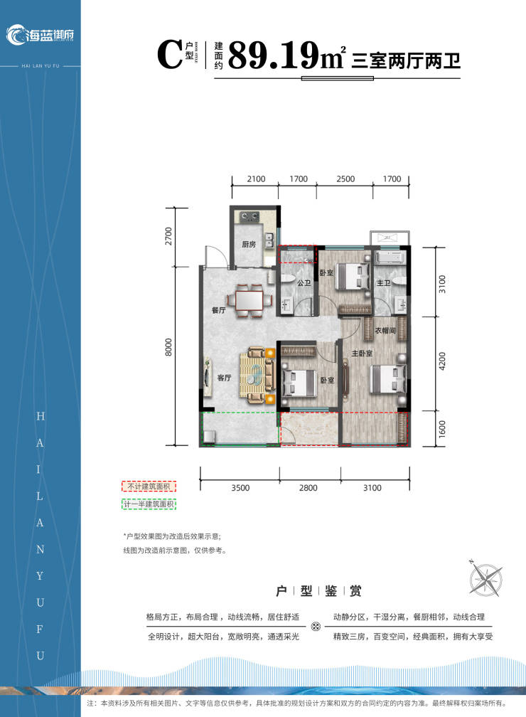 全明设计:户型设计南北通透,宽面全景双阳台,保证每个房间都有良好的采光和通风,还能提供放松和享受户外景色的空间,大大的提升了居住的舒适度;