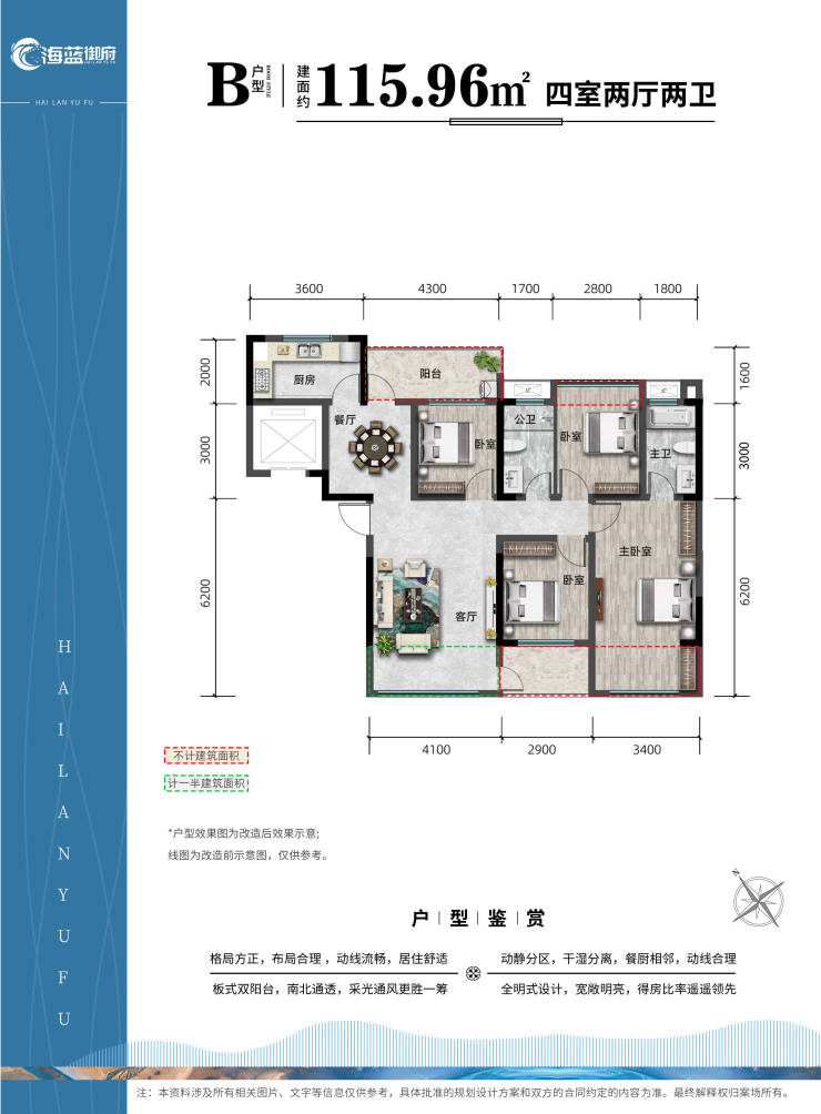 全明设计:户型设计南北通透,南向采用整体全阳台设计,保证每个房间都有良好的采光和通风,还能提供放松和享受户外景色的空间,大大的提升了居住的舒适度;