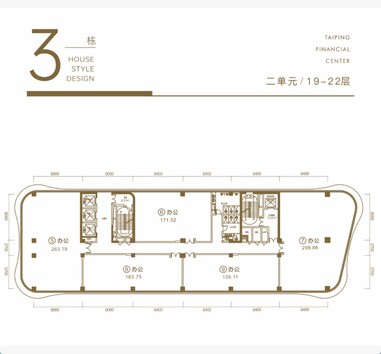 星级结构——空间布局均为100㎡以上空间,采用大开间短进深,配合大采光面270°转角,非核心筒建筑结构。