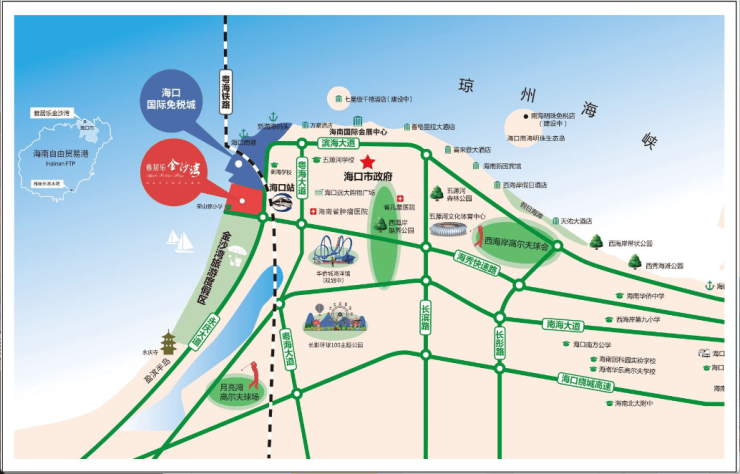 交通配套:海秀快速路二期贯通,海陆地铁立体交通网络发达,项目紧邻新海港生态规划新城,东侧为火车站,出行便利。