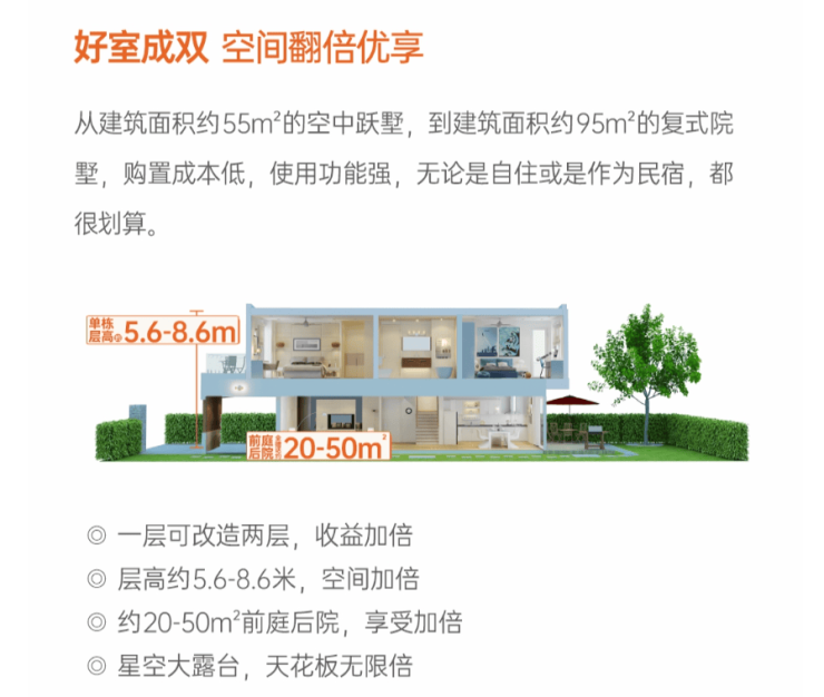 爱上山·梦想小镇,约55-75㎡梦想叠层,自由购。小户大空间,大露台赠送,一览山、海、城美景;5.6米超高层高,百变空间无浪费,超大得房率;民水民电,可商、可宿、可创业。