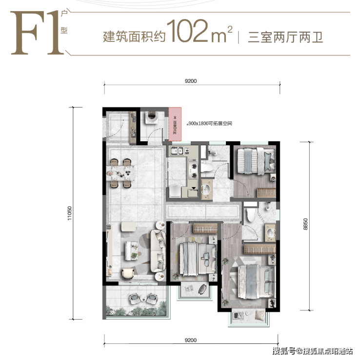空间升级:双阳台设计、92-102m²X百变可拓展空间、可做功能阳台&卫浴、2.4米入户门(比行业标准高20cm)