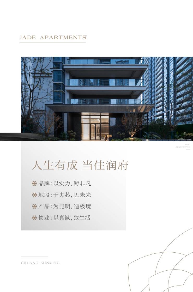 昆明·润府秉承国际前沿城市运营理念,深研城市高净值人群的生活品味与价值追求,以其创新设计理念、优异品质和全新生活方式的注入,以近乎偏执的苛刻规范精雕细琢,从工艺、安全、健康、人性化五大品质标准,匠心定制主城高端住所。一线品牌臻装,更好匹配春城壹号人物。