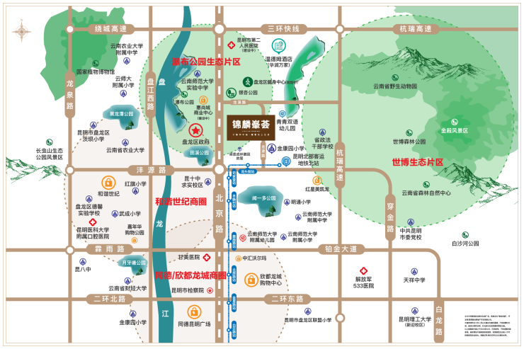 位置:昆明市盘龙区北京路与沣源路交叉口向北一公里(银杏公园旁),地处北市区核心发展区域。