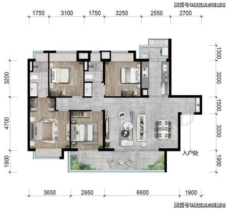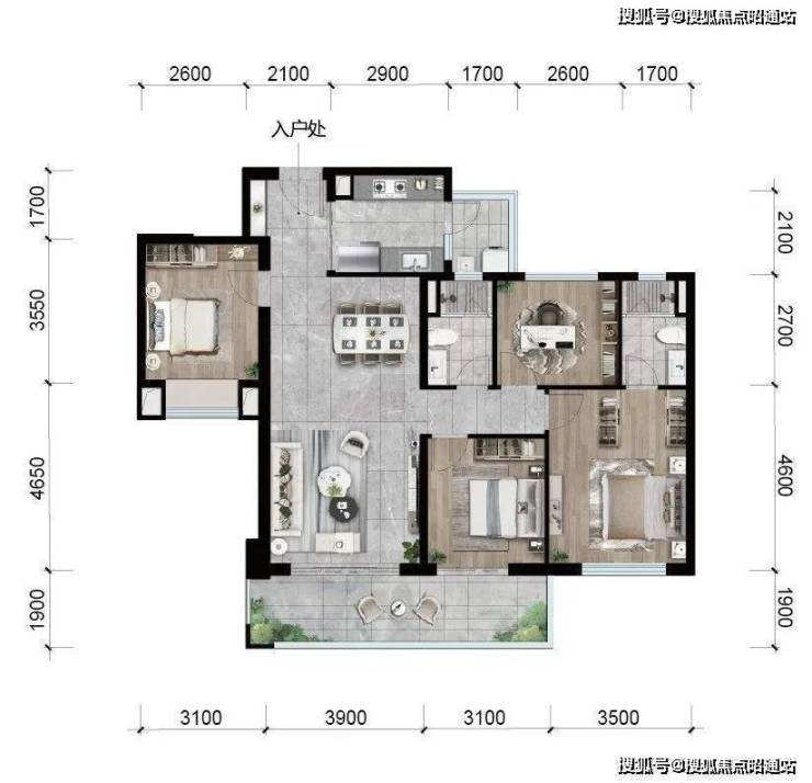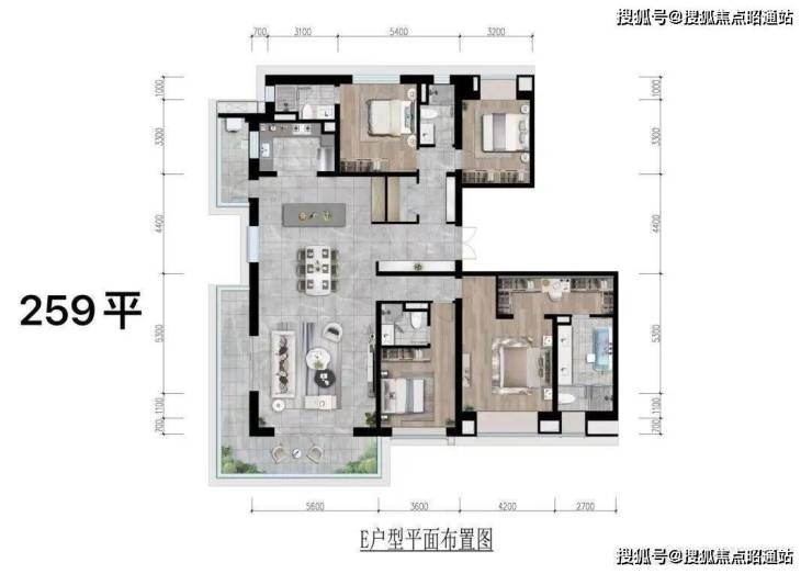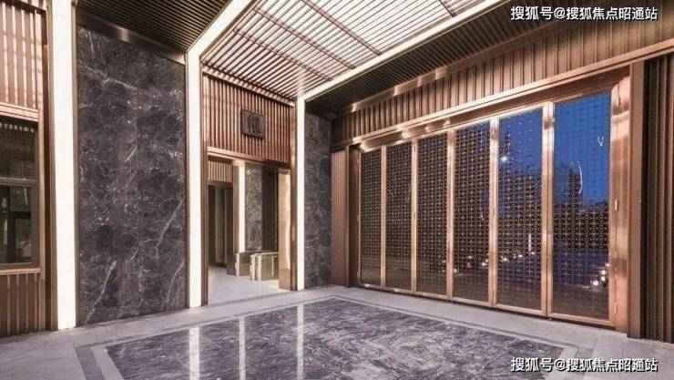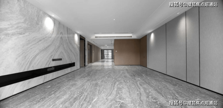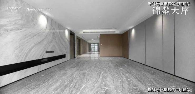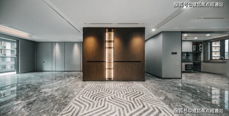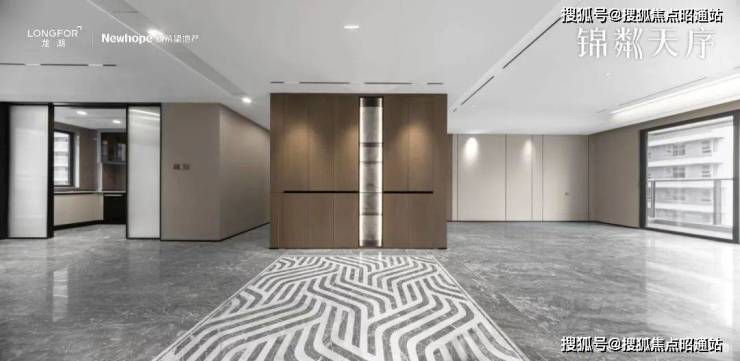 昆明龙湖新希望锦粼天序总205㎡大平层餐客厅地面均采用深色系进口石材,中间玄关则是工艺要求和成本更高的水刀拼花。