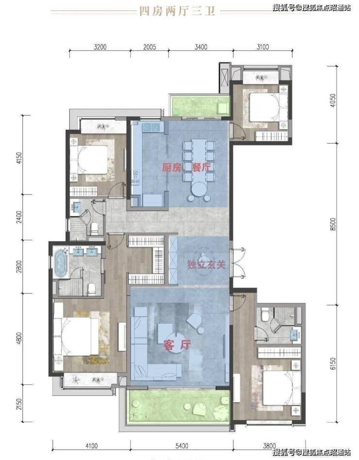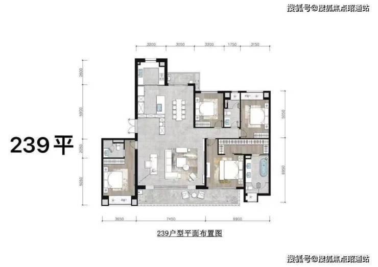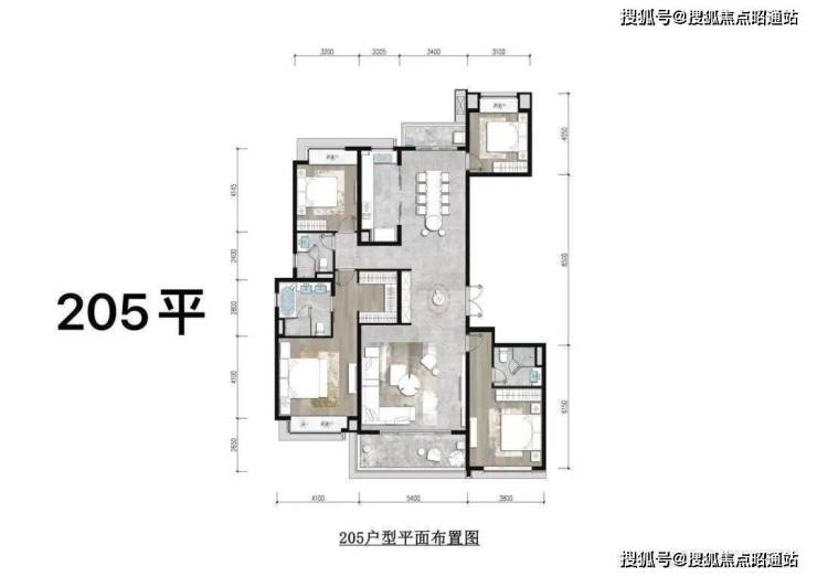 ▲锦粼天序205㎡户型图,205㎡户型,4房2厅3卫设计,多开间朝南;