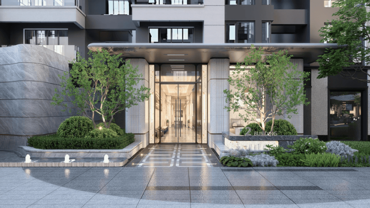 礼仪之门:以水景、景墙等为核心,设计精致、大气入户大门,让每一次归家充满仪式感