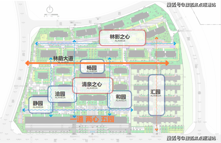 项目园林完整继承了蒙德里安抽象艺术的内涵精髓,以几何图形的切割唤醒园林想象力,以多维线条勾画场地布局,形成精湛而丰富的“一道、两心、五园”臻美园林景观。