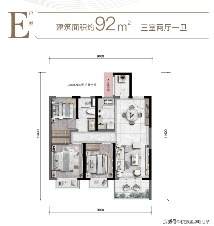 空间升级:双阳台设计、92-102m²X百变可拓展空间、可做功能阳台&卫浴、2.4米入户门(比行业标准高20cm)