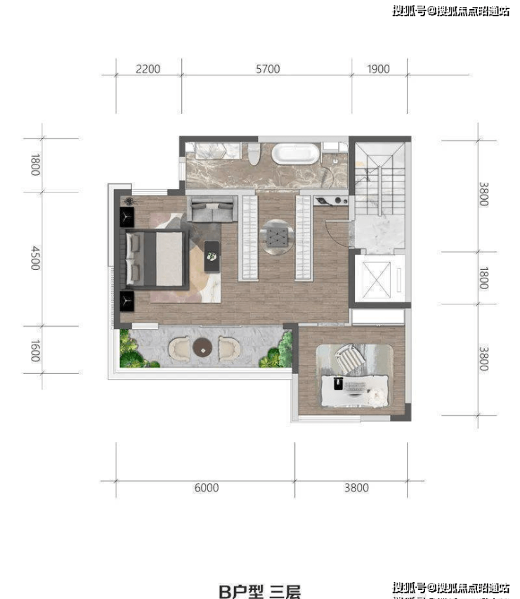 三层:主卧套房设计,附带露台和休闲区;