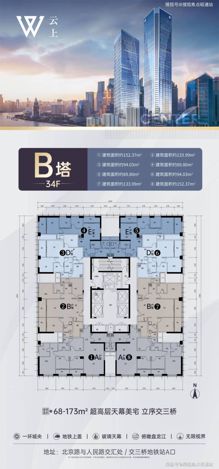 B塔为住宅楼:高约160米,共49层,配置10.2米挑高大堂,5部品牌高速电梯。