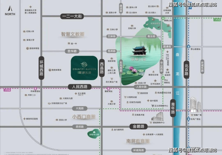 碧桂园·翠湖云顶位于五华区龙翔街道办事处西昌路与昆华路交汇处,项目紧邻翠湖公园,处于昆明传统富人区,翠湖作为昆明城市名片,被誉为昆明的“绿宝石”,昆明的“眼睛”,自古以来依翠湖而居,而翠湖云顶项目傲踞一环内翠湖板块,直面一中,集萃商业、医疗、教育、交通醇熟配套,真正做到“出则繁华、入则宁静”为一环内稀缺的城市豪宅。