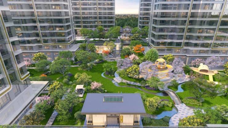 东方文化园林景观:项目于2.2万平方米的景观中,匠心打造5500平方米的住宅下沉庭院,整座园林荟萃亭、台、楼、阁、山、谷、溪、瀑、园九重意境,融汇诗、词、画、曲等文化精粹,构筑一幅可游可居的“地上文博馆”。