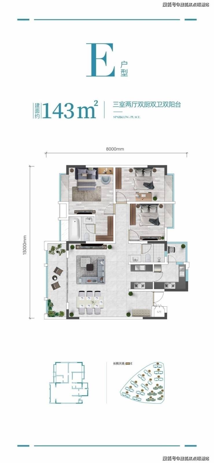 143㎡三房两厅双厨双卫双阳台,奢阔超大阳台空间,采光采阳充足,大三房设计,居住舒适度高,主卧豪华套房式设计带独立衣帽空间,双厨房配置烹饪空间更得心应手,厨房直连生活阳台洗晒便利