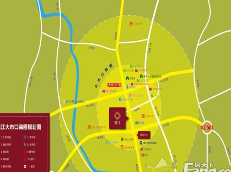 商场或超市:八佰伴、大祥时尚街,商业城,自带商场 学校:南门大街小学、镇江第四中学,镇江中山路小学,镇江红旗小学,镇江八叉巷小学。 餐饮娱乐:KFC大市口店、花都KTV、国际饭店、紫金大厦 周边写字楼:八佰伴写字楼 邮局和快递:镇江大市口邮局 医院:京口区社区医院 银行/银行(ATM):江苏银行、交通银行、中国银行、工商银行、农业银行 住宅:苏宁广场酒店式公寓 酒店:镇江国际饭店、宴春酒楼 休闲健身:老体育馆 其他:市图书馆、市中级人民法院
