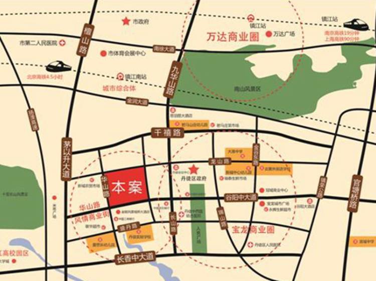 驾车:距离主城区约10公里,而且道路通达无拥堵现象,驱车15分钟可以到达主城核心区。2011年8月建成通车的京沪高铁镇江南站距离本项目仅4.5公里,从此乘座高铁至上海约1小时,至北京也就3小时48分钟。从项目驱车不出10分钟就可进入高速路段。