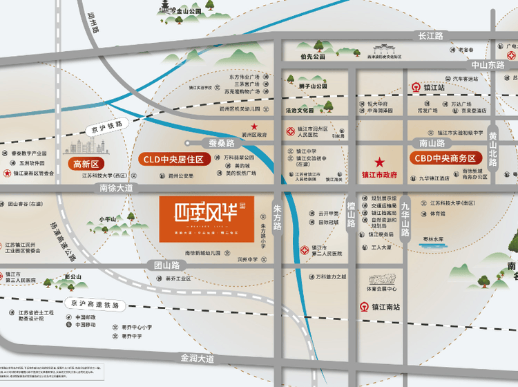学校 江苏省镇江中学、镇江实验初中(在建)、纽耶幼儿园、南徐新城幼儿园、朱方路小学