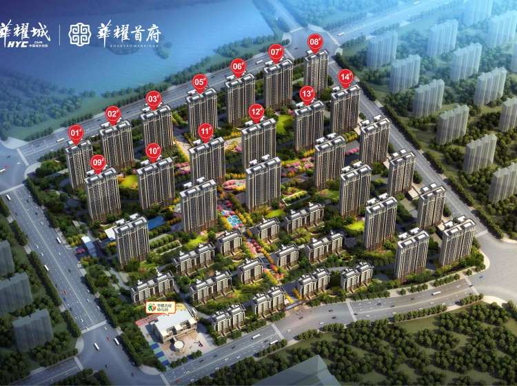 75万方城市综合体 遇鉴未来城芯生活 周口华耀城城市综合体,规划建设75万方,项目建成后将结合时尚商业步行街、星级酒店、商务办公楼、高端住宅等多种业态,集购物、休闲、娱乐、文化、餐饮、商务、居住等多功能为一体,实现吃、喝、玩、乐、购一站式生活体验,全方位提高体验式业态配比,融合创新,改变周口商业商务现状与生活格局,重新定义周口繁华,遇鉴未来城芯生活。 核心枢纽商圈 立体交通 便捷生活 项目地处东新区核心发展经济圈,占据市政规划核心地段,位处腾飞路与松花江路交汇处,东临大成路,西至腾飞路,北临松花江路流沙河景观带,南至平安路。紧邻周口市政府,位居行政中心区域黄金地段,多条公交车线路经过,畅达全城。临近高速公路,距离高铁站1.5公里,全方位立体交通,便捷出行。周边大型商场、生活超市、美食街、银行、医院、学校等环伺,毗邻华耀城商贸物流中心,位居核心枢纽商圈,尊享便捷舒适生活。 46万方河畔雅居 成就居住梦想 华耀城高端住宅项目——华耀首府,46万方河畔雅居,项目采用现代中式建筑风格,彰显贵族式优雅风范。小区设置4000㎡幼儿园、绿色跑道、儿童体验乐园、主题雕塑、体育设施等,人性化的体验设计,打造出绿色健康的生态住宅区。“仁者乐山,智者乐水”,近河赏林,纵享繁花,依河畔而居,在恬淡与宁静中,感受美好生活,成就居住梦想