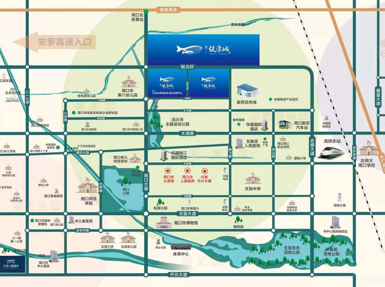 项目位于周口大道与贾东干渠交汇处,处周口北区核心发展区位,按照周口市人民政府城市规划发展的引导、周口北区属于周口-西华休闲旅游发展带的核心龙头位置,是新老城区十字发展轴的交叉位置,更是未来人流、资金流、物流、商贸流聚集的上风上水之地。 区域内有川汇区政府、人大、政协、纪检委、周口市畜牧局、川汇区人民检察院、信访局等多个机关事业单位集聚集,并逐渐形成了以周口华耀城、中原国际商贸城、万国车世界为代表的百亿商贸圈;以周口天立学校、周口新星学校、十二中、幼儿园等,荟萃多个优势中小学校集中地北区教育圈;以周口市第三人民医院、周口森林公园、川汇生态游乐园等多项配套繁华生活圈,选择周口北区,即是选择周口未来。