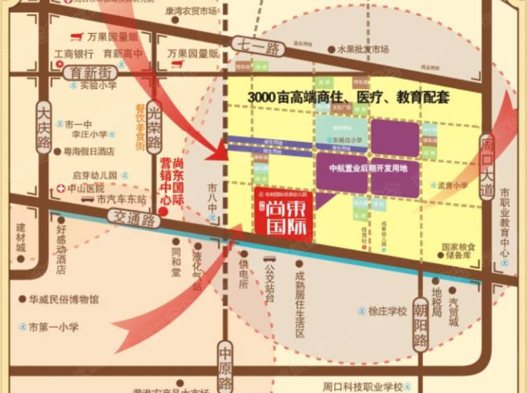 中航·尚东国际雄踞周口经济开发区核心区位,扼守城市主干道交通路,延续七一路商业繁华,周边优质教育资源环绕,未来3000亩高端商住、医疗、教育配套。国际知名的布朗国际双语幼儿园、高贵典雅的新古典建筑风格,清新自然的美式田园风光,多重智能安防,殿堂级地标豪宅,总建面积15万㎡,集精品住宅、风情商业、星级酒店、高端写字楼为一体,以国际化的视野重新定义周口城市格局: