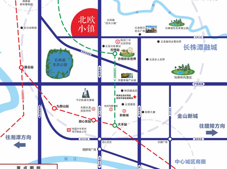 新华联北欧小镇是2009年由株洲市政府招商引资入驻云龙示范区的重点项目, 由株洲新华联房地产开发有限公司开发建设。项目地处长株潭融城中芯区域,坐落于株洲云龙示范区云田镇高福社区。北欧小镇规划总用地面积近1000亩,规划总建筑面积约50万平米,总投资约40亿元。北欧小镇规划建设高端亲子旅游主题度假酒店、大型嬉水乐园、北欧风情商业街区、高品质住宅等物业类型,是集旅游、休闲、生态、文化、居住等多功能为一体的文化旅游项目。项目区域交通便捷,周边配套丰富。长株高速、沪昆高速、云龙大道、洞株公路遍布项目周边,项目距长沙、株洲、湘潭三市城区以及黄花国际机场、武广高铁站车程快速直达。