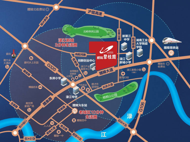 醴陵碧桂园,临创新创业服务中心(在建)、渌江产业服务中心(在建)、新市妇幼(在建)、高铁站等配套。