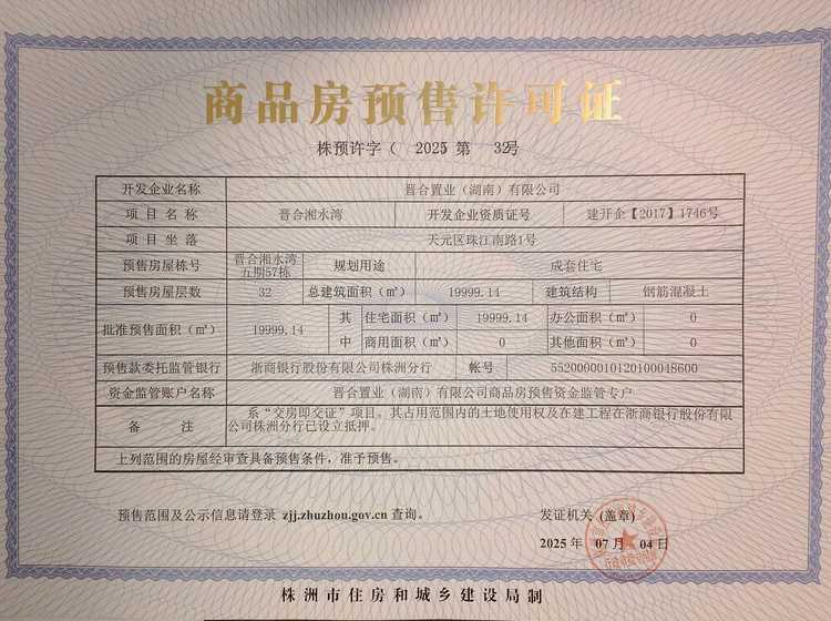 - 株预许字(2018)第432号 详情发证时间 2018-08-28绑定楼栋天元区湘湾路8号晋合湘水湾六期37栋