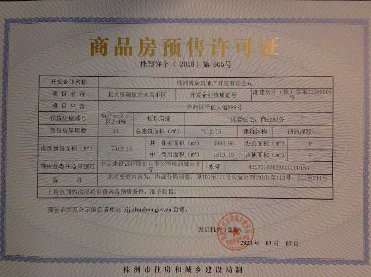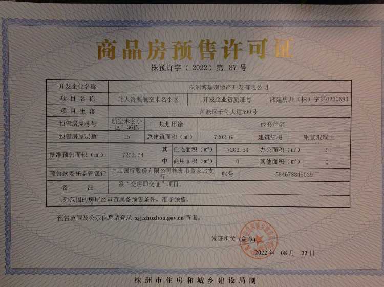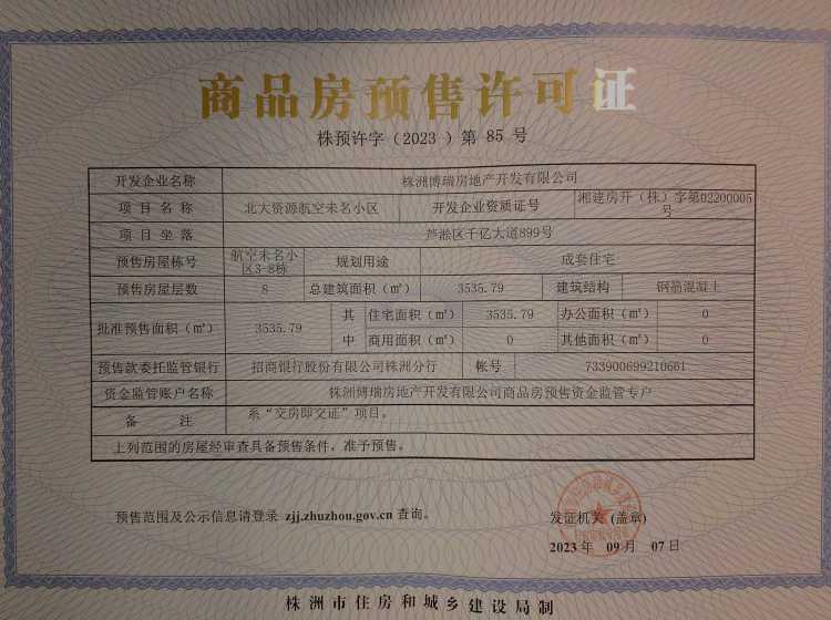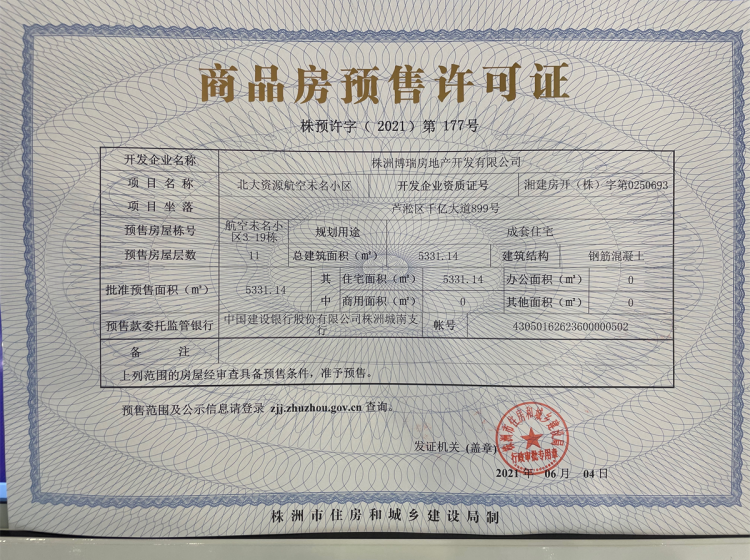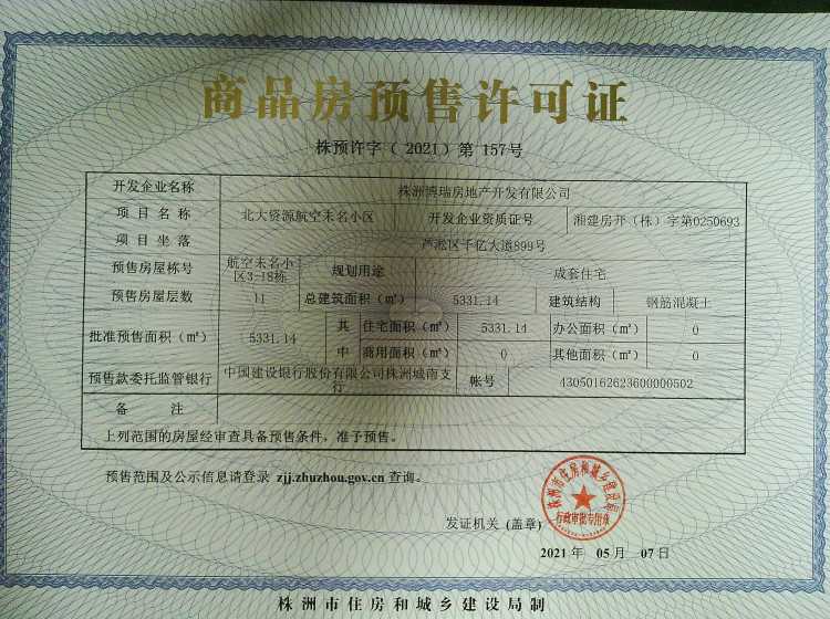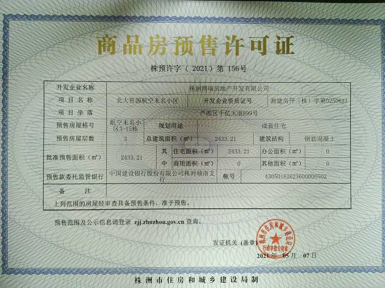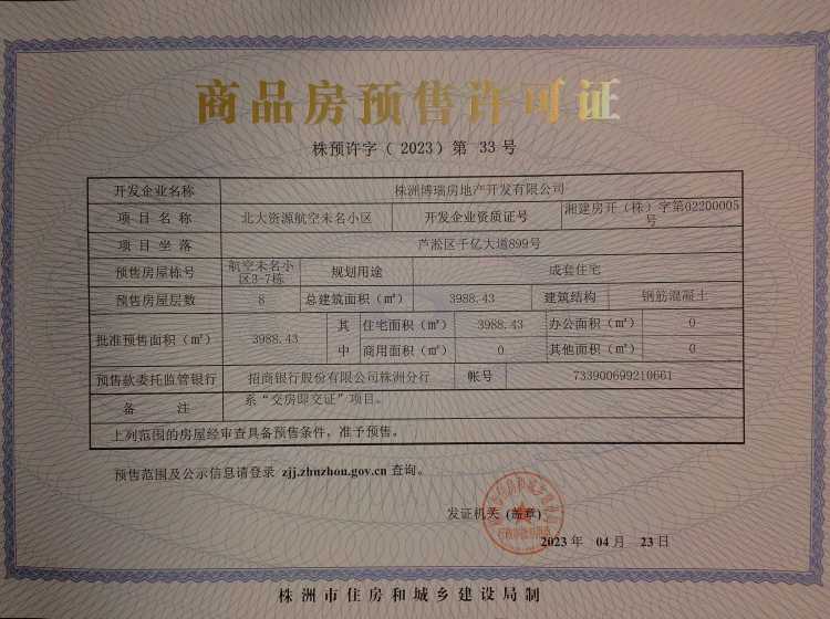- 预许字(2023)第56号 详情发证时间 2023-06-05绑定楼栋芦淞区航发大道1066号北大资源航空未名小区3-16栋