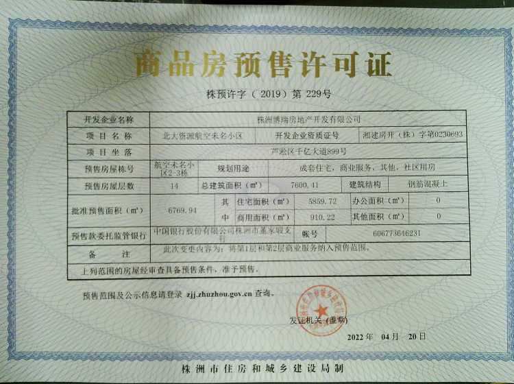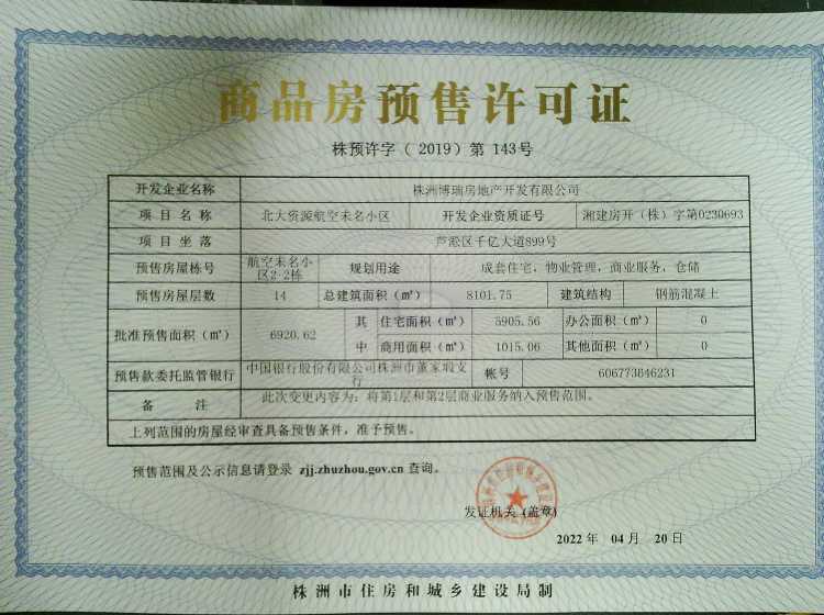- 预许字(2020)第15号 详情发证时间 2020-01-13绑定楼栋芦淞区千亿大道899号北大资源航空未名小区2-5栋