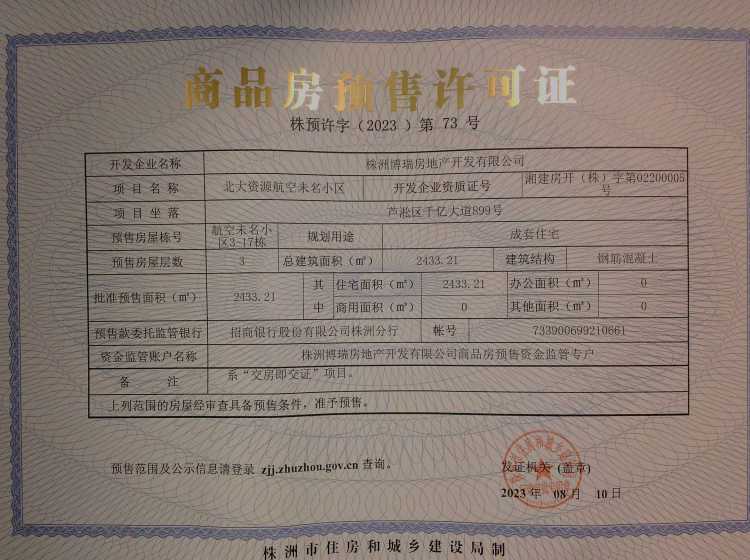 - 预许字(2023)第73号 详情发证时间 2023-08-10绑定楼栋芦淞区航发大道1066号北大资源航空未名小区3-17栋