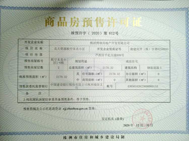- 预许字(2020)第612号 详情发证时间 2020-12-31绑定楼栋芦淞区千亿大道899号北大资源航空未名小区1-6栋