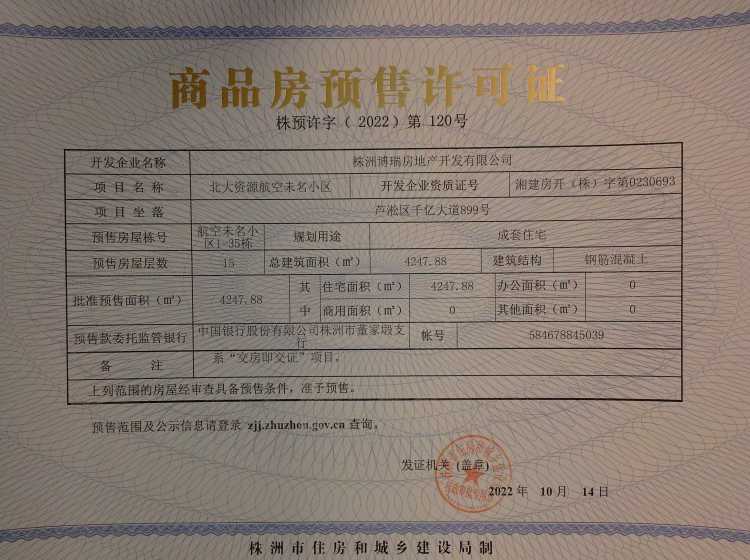 - 预许字(2022)第120号 详情发证时间 2022-10-14绑定楼栋芦淞区千亿大道899号北大资源航空未名小区1-35栋