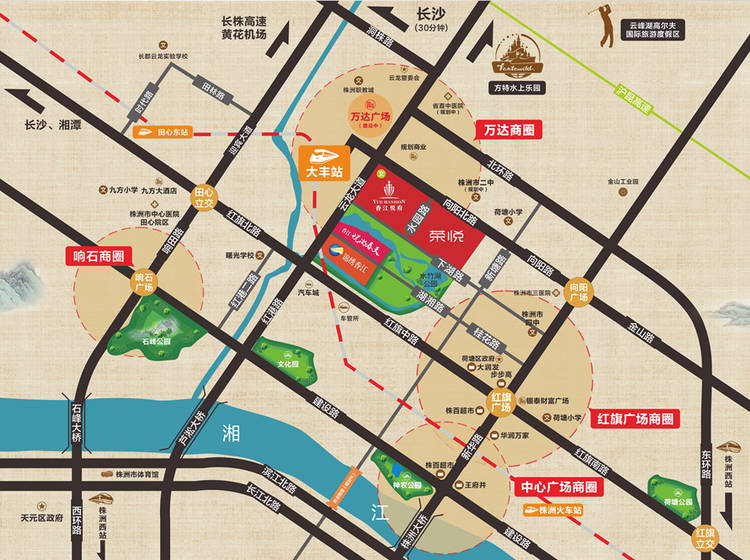 10万㎡万达广场、1.2万㎡社区商业(香江悦府一期自带9千㎡社区商业、香江悦府二期自带3千㎡社区商业)。