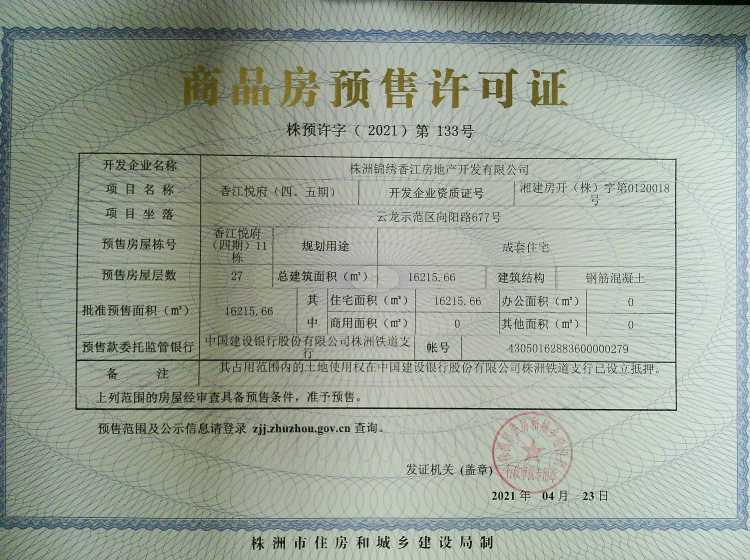 - 预许字(2021)第133号 详情发证时间 2021-04-23绑定楼栋云龙示范区向阳路677号香江悦府(四期)11栋