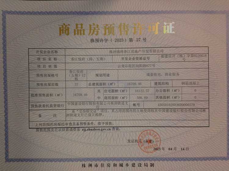 - 预许字(2023)第27号 详情发证时间 2023-04-14绑定楼栋云龙示范区向阳路677号香江悦府(五期)12栋
