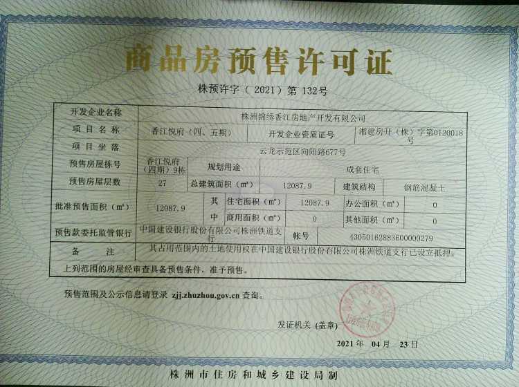 - 预许字(2021)第132号 详情发证时间 2021-04-23绑定楼栋云龙示范区向阳路677号香江悦府(四期)9栋