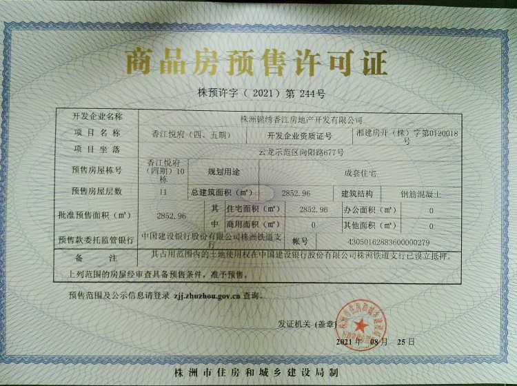 - 预许字(2021)第244号 详情发证时间 2021-08-25绑定楼栋云龙示范区向阳路677号香江悦府(四期)10栋