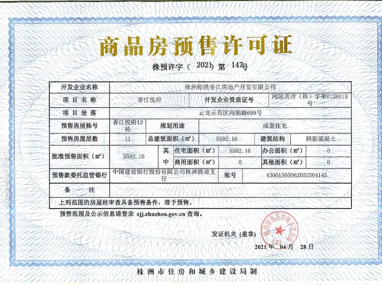 - 预许字(2021)第147号 详情发证时间 2021-04-28绑定楼栋云龙示范区向阳路699号香江悦府13栋