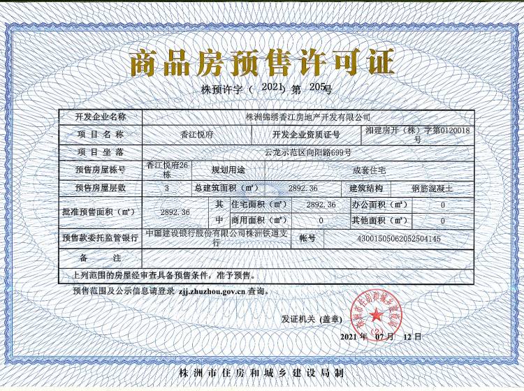 - 预许字(2021)第205号 详情发证时间 2021-07-12绑定楼栋云龙示范区向阳路699号香江悦府26栋