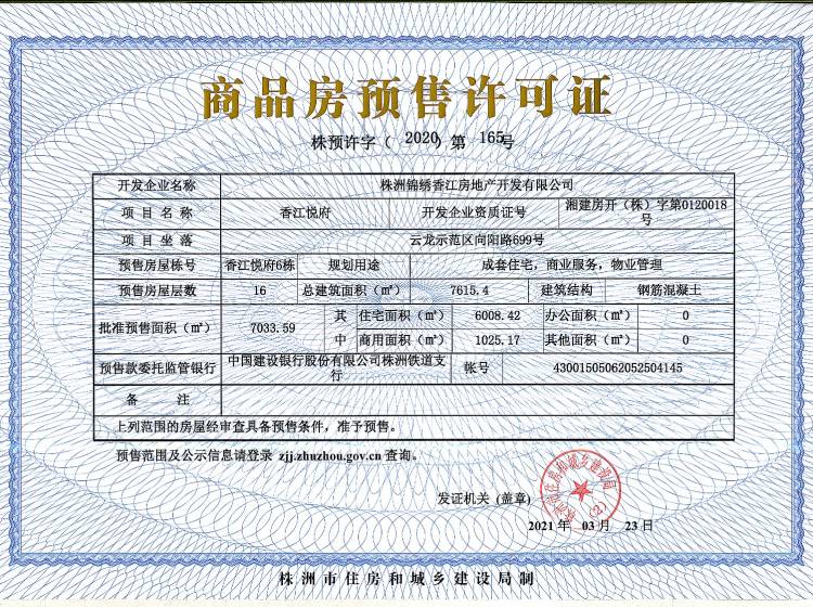 - 预许字(2020)第165号 详情发证时间 2020-05-22绑定楼栋云龙示范区向阳路699号香江悦府6栋
