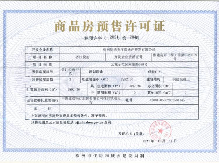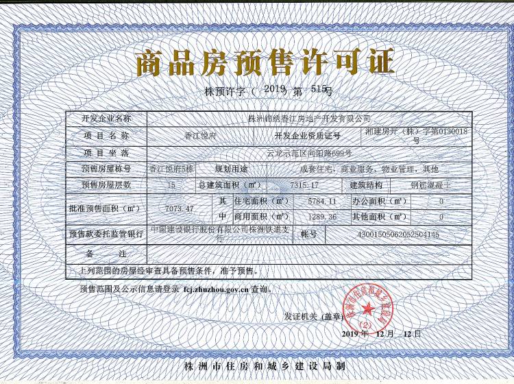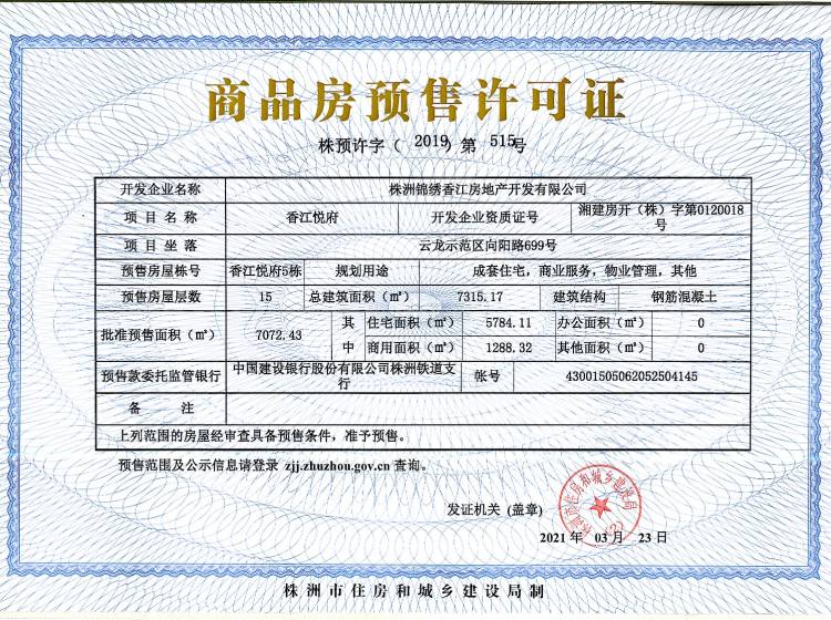 - 预许字(2019)第515号 详情发证时间 2019-12-12绑定楼栋云龙示范区向阳路699号香江悦府5栋